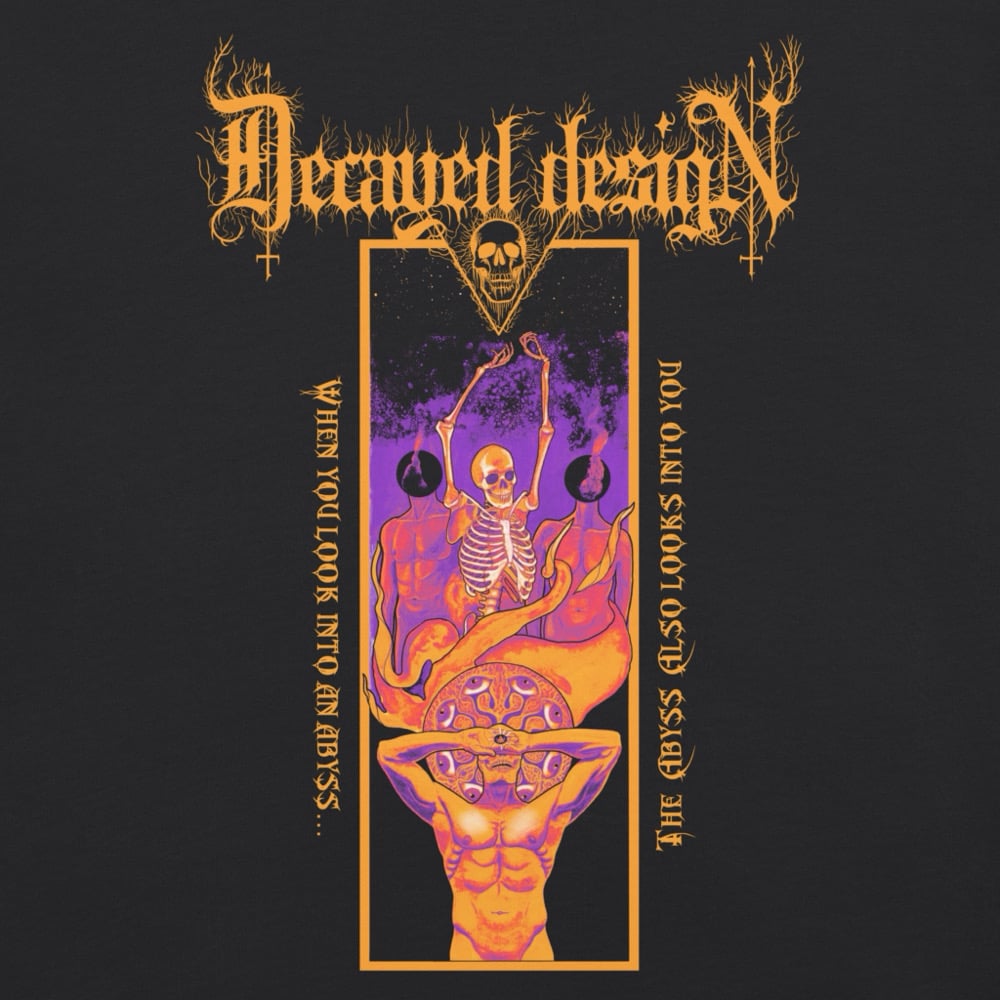 This shirt is a thick, structured tee that’s also super soft and breathable by the Comfort Colors brand. The front design features the Decayed Design logo with the “Abyss” artwork, with the quote “When you look into an abyss… the abyss also looks into you” along the border of the frame. This unisex garment-dyed heavyweight t-shirt is made of 100% ring-spun cotton in a regular t-shirt style. All shirts are printed on demand from Printful.