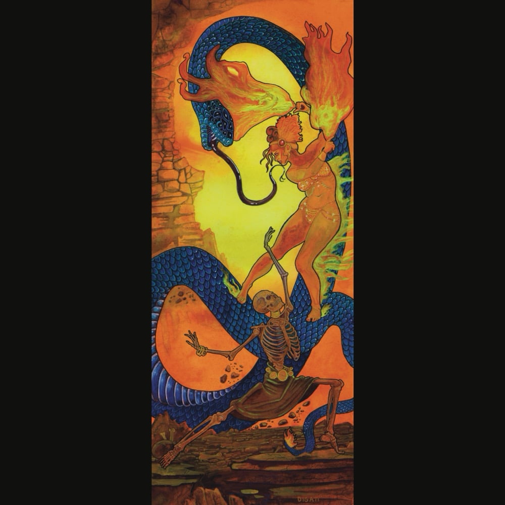 The Firebird, a symbol of change and transformation, stands defiantly against the world destroyer: The Serpent. Death views the skirmish from below, not interfering.